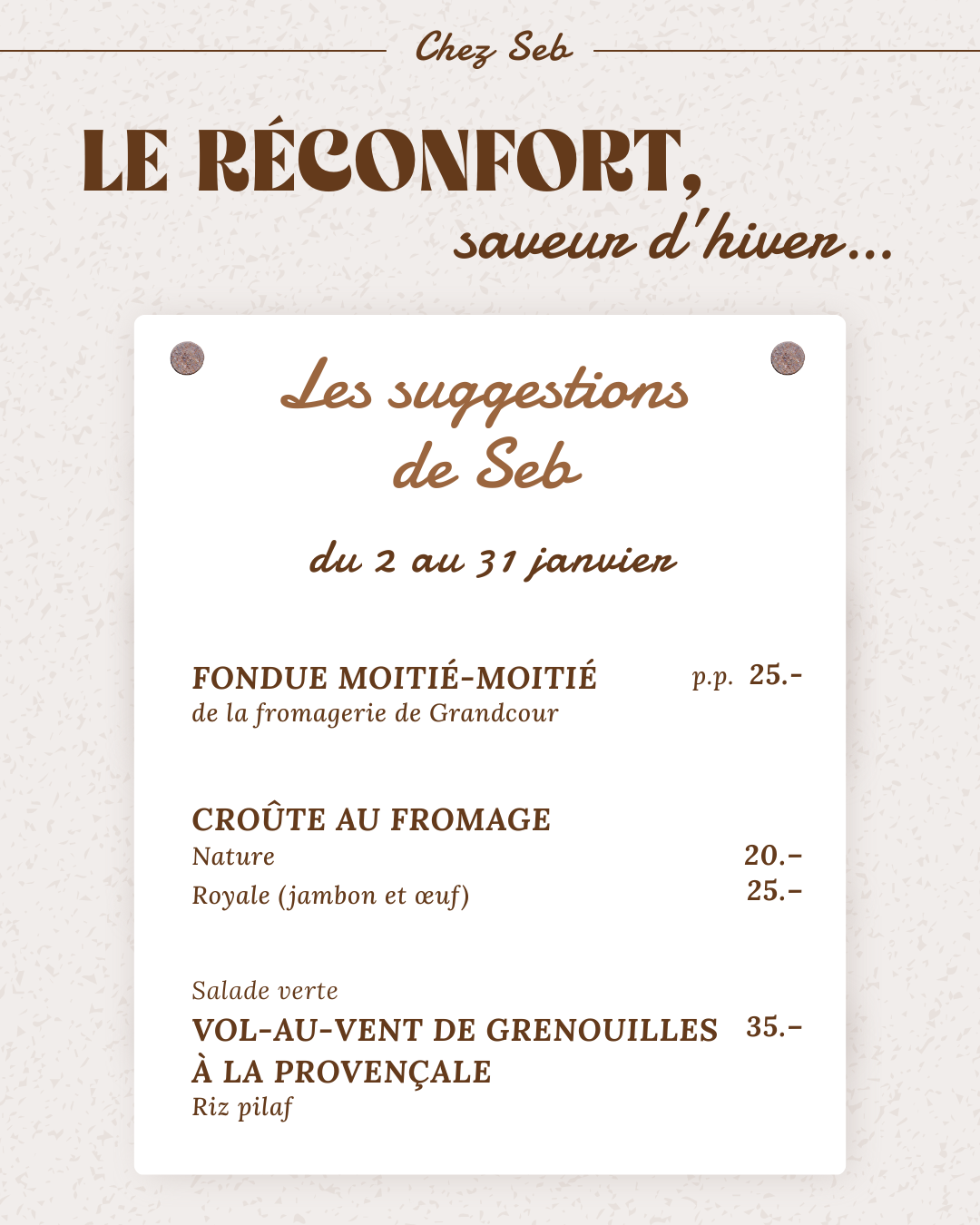 Le repas est proposé au prix de 50.– par adulte, 25.– pour les enfants de 8 à 12 ans, et seulement 1.– par année d’âge pour les plus petits (1 à 7 ans). Uniquement sur inscription jusqu’au 21 janvier.